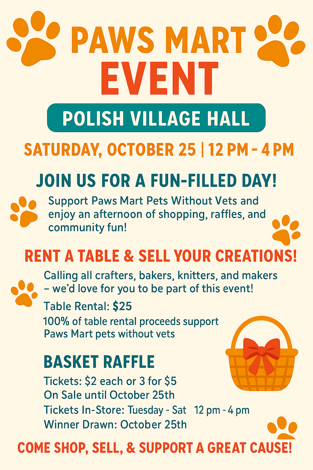 « All Events Paws Mart Fundraiser October 25 @ 12:00 pm - 4:00 pm Event Navigation « Super Saturday – Paper Roll Pumpkins Ghost Art » + Google Calendar+ iCal Export Details Date: October 25 Time: 12:00 pm - 4:00 pm